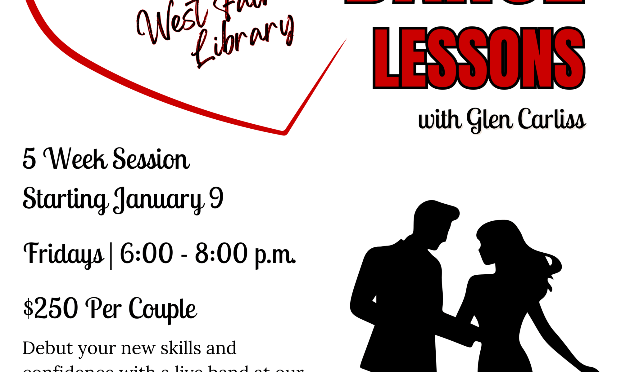 Dress to impress in your favorite formal wear for our last lesson on February 13 where we will debut and celebrate your new-found skills and confidence with a live band!