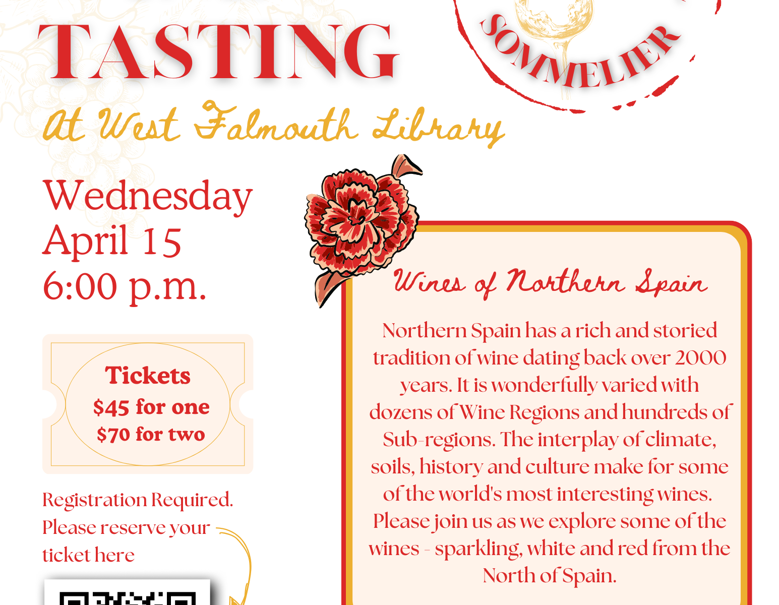 Sommelier Steve Bodell returns to the library for a Spring wine tasting, this time of Northern Spain, Wednesday, April 15 at 6 p.m. Tickets are $45 each; $70 for a pair.