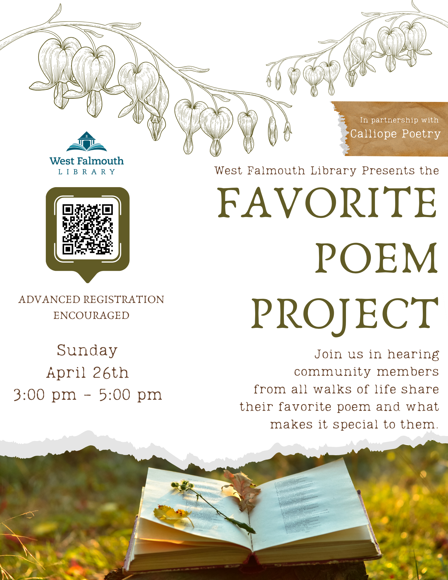In partnership with Calliope Poetry, we are so pleased to once again host the Favorite Poem Project on Sunday, April 26, from 3 to 5 PM. Join us in hearing community members from all walks of life share their favorite poem and what makes it special to them. About the Favorite Poem Project: At its …
