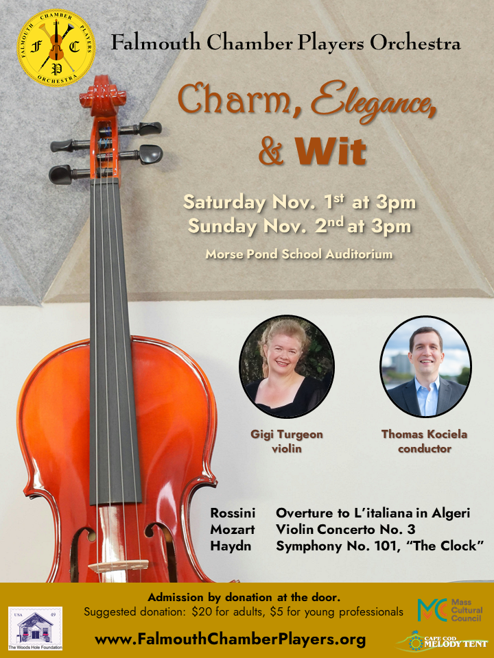 The Falmouth Chamber Players Orchestra, under the direction of conductor Thomas Kociela, will present its Fall Concerts, titled “Charm, Elegance, and Wit,” on Saturday, November 1, at 3 PM, and Sunday, November 2, at 3 PM, at Morse Pond School Auditorium, 323 Jones Road, in Falmouth. The program includes the Overture to L’italiana in Algeri by Rossini, Mozart’s Violin